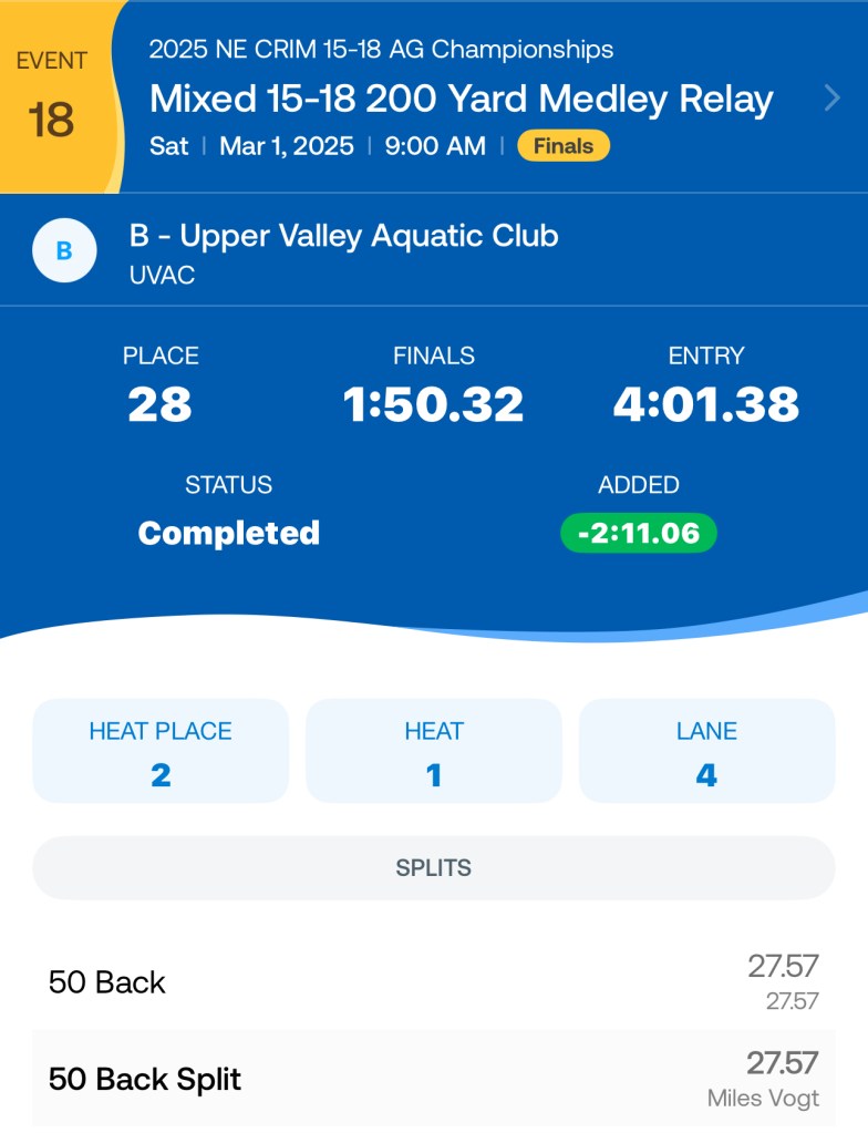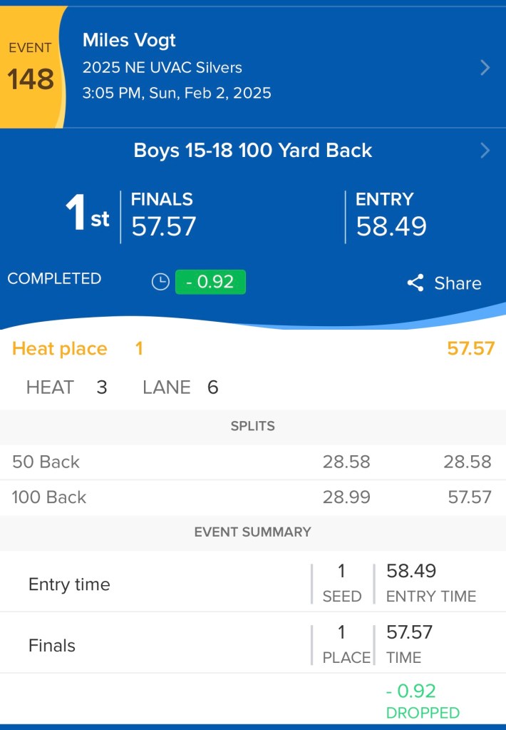 100 Back – 57.57 PB, NE UVAC Silvers Meet 2/2/25
